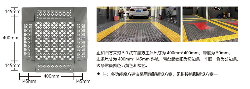 1. 分為3.4.5.厚度,解決不同厚度,統(tǒng)一紋路的問題 2. 啞光平紋設計,防滑,美觀,易清潔 3. 選用高級原料,加入其他輔料,顏色亮麗,無異味,無污染 4. 顏色為紅黃藍綠黑灰六色,滿足客戶用色需求,搭配屬于自己的風格 5. 通扣鎖扣設計,容易鋪設且容易拆卸打理 6. 加強支撐,不容易出現(xiàn)壓壞壓斷現(xiàn)象,滿足大多數車輛施工的要求 7. 使用年限長,五年超長質保,使用無后顧之憂 8. 十字支撐,保證承載最大化的同時,且易排泥排水