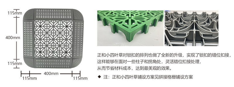 正和小四葉草采用通扣設計,可以確保產(chǎn)品鋪設完成后在任何區(qū)域單獨取出,極大的方便了客戶后期局部清理泥沙等,給店面的日常衛(wèi)生維護提供了很好的基礎。