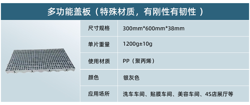 1、 超強耐壓,是唯一一款可以上大貨車,工程車,消防車等重型車輛的洗車格柵。 2、 可以懸空鋪設,在跨度15CM以內提供質保。 3、特殊材質,有剛性有韌性。 4、外觀為小孔玻璃鋼款式,防高跟鞋。 5、平鋪后四周可以鋪瓷磚,應用于高檔三膜店,金屬質感,高檔豪華。 6、可以橫豎交叉鋪設,鎖扣均可扣接。 7、 應用廣泛,隨意搭配,美觀實用。