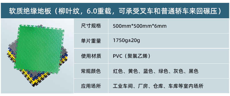 5、高承載,更防滑: 軟質(zhì)絕緣地板為實心結構,只要地面承重沒有問題,其承載能力能夠達到每平米10噸以上。地板表面在生產(chǎn)過程中帶有